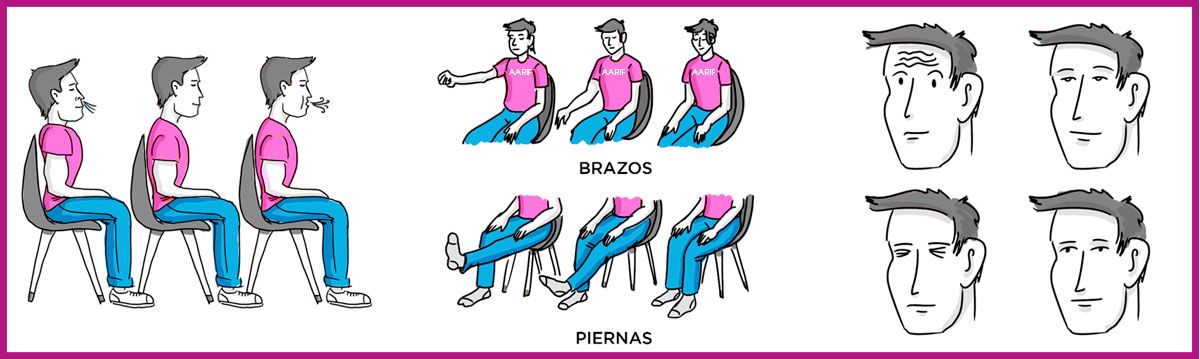- Parte superior de la pierna y muslo dominantes: inspira profundamente y pon el músculo largo de encima de la pierna en contraposición con los de la parte de atrás. Intenta levantarte del asiento pero sin llegar a conseguirlo. Mantén la tensión unos segundos y relaja progresivamente, relaja y respira 30 segundos.
